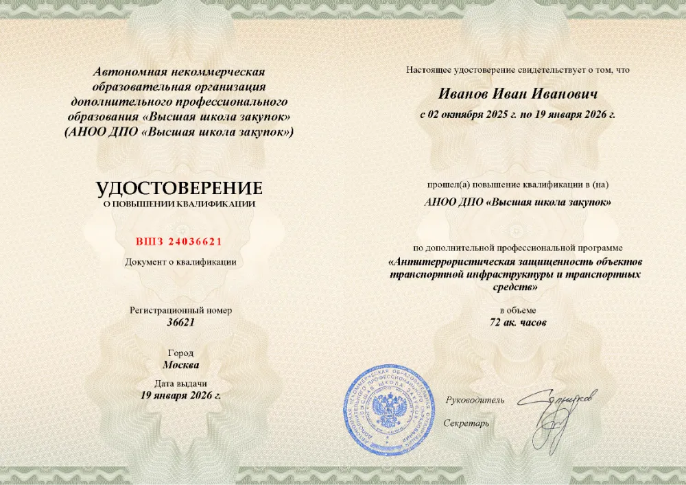 Повышение квалификации, 72 академических часов, 7 модулей: нормативно-правовые основы противодействия терроризму, анализ угроз и рисков, функциональные обязанности ответственных, инженерно-техническая укрепленность, документооборот и действия персонала при ЧС. Онлайн-обучение в в Великом Новгороде с итоговой аттестацией.