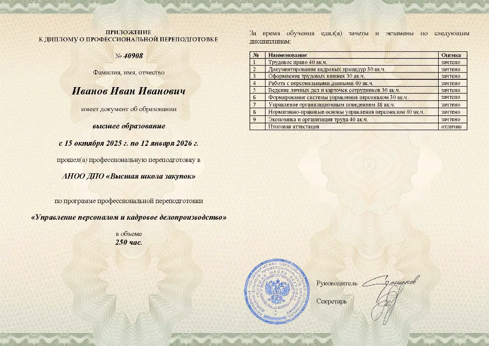Профессиональная переподготовка, 250 академических часов, 19 модулей: трудовое законодательство и кадровое делопроизводство, подбор, мотивация и оценка персонала, психология менеджмента и разрешение конфликтов, автоматизация документооборота и работа с персональными данными. Онлайн-обучение в в Великом Новгороде с итоговой аттестацией.