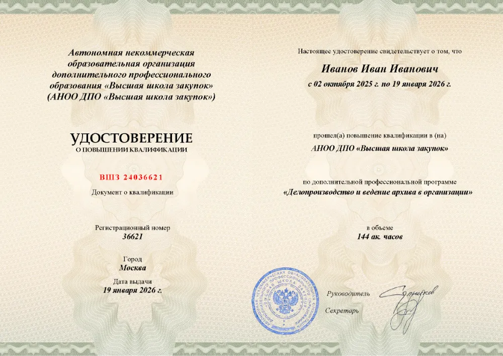 Программа повышения квалификации (144 часа) для специалистов по делопроизводству. Освойте ведение полного цикла документации и архива: от подготовки служебных и кадровых документов до работы с конфиденциальными материалами, международной перепиской и правилами хранения. Онлайн-обучение в в Великом Новгороде с итоговой аттестацией.