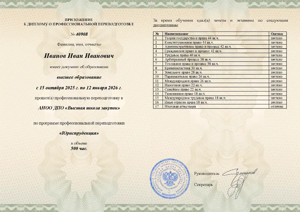 Профессиональная переподготовка, 500 академических часов, 16 модулей: теория государства и права, конституционное, гражданское, уголовное и трудовое право, арбитражный и административный процесс, налоговое, земельное, таможенное и международное право. Онлайн-обучение в в Великом Новгороде с итоговой аттестацией.