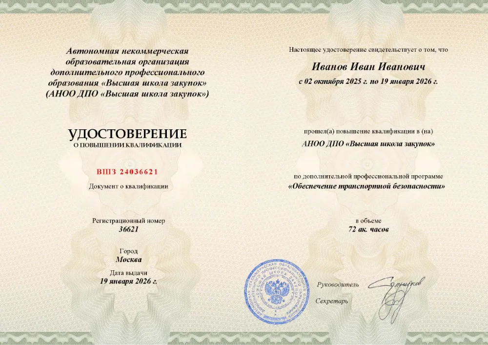 Повышение квалификации, 72 академических часа, 10 модулей: нормативная правовая база и система мер обеспечения транспортной безопасности, планирование и реализация защитных мероприятий, информационное обеспечение и государственный контроль, оценка состояния защищенности объектов. Онлайн-обучение в в Великом Новгороде с итоговой аттестацией.