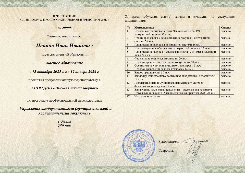 Программа профессиональной переподготовки 250 академических часов для специалистов по закупкам по 44-ФЗ. Курс охватывает полный цикл закупочной деятельности, проходит в дистанционном формате с практической направленностью. По итогам выдается диплом о профессиональной переподготовке с присвоением квалификации.